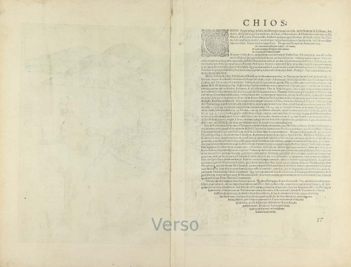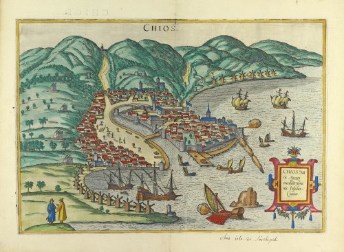 COMMENTARY BY BRAUN (on verso): "Chios is one of the Ionian Islands, where there is a city that is renowned for its seaport [...], which Thucydides calls the greatest and richest of all Ionian cities. Nothing is more famous on this island than the wine that bears its name: Chian wine, it is the best of all Greek wines, as both Strabo and Aelian confirm. [...] The island is just as famous for a tree called Lentiscus in Latin, which is native to it, and from which gum or resin drips, known as mastic."