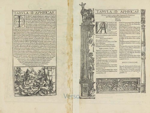 On the reverse, the text is contained within elaborate Renaissance woodcut panels, which may have been designed by Albrecht Dürer, the known contributor to diagrams elsewhere in the atlas.