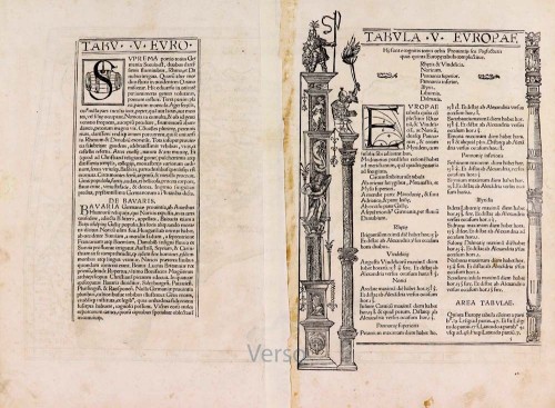 On the reverse, the text is contained within elaborate Renaissance woodcut panels, which may have been designed by Albrecht Dürer, the known contributor to diagrams elsewhere in the atlas.