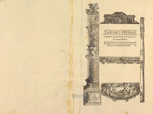 On the reverse, the text is contained within elaborate Renaissance woodcut panels, which may have been designed by Albrecht Dürer, the known contributor to diagrams elsewhere in the atlas.