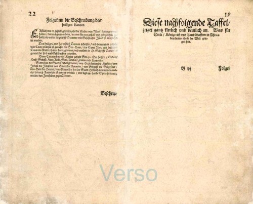 The book gave an overview of biblical geography based on the travel descriptions of various notable people from the Old and New Testaments. It contained ten woodcut maps, including three figurative maps: the world depicted as a cloverleaf with Jerusalem in the centre, Europe in the shape of a crowned woman, and Asia as the winged horse Pegasus.