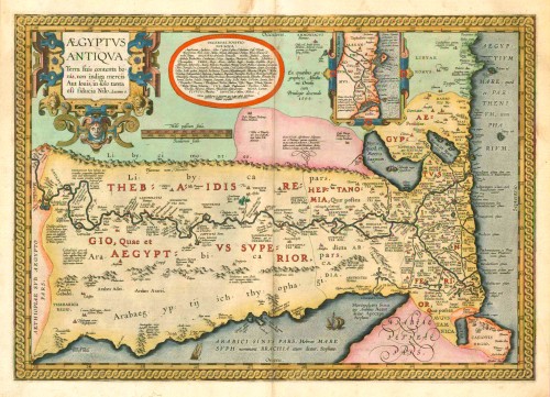 Old, antique map of Ancient Egypt by A. Ortelius, oriented to the West