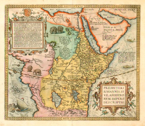TRANSLATION OF CARTOUCHE TEXT: "Presbyterius Ioannes, specially chosen by God, pillar of faith, born from the tribe of Judah, son of David, son of Salomon, son of the pillar of Zion, son from the seed of Jacob, son of the hand of Maria, son of Nahum's flesh, son of the holy Peter and Paul in mercy, emperor of upper and great AEthiopia, and of the legal grounds and countries of the most elevated kingdoms; king of Goa, Caffates, Fatigar, Angota, Baru, Balinguanza, Adea, Vangua, Goiama where the Nile has its sources, of Amara, Banguamedrum, Ambea, Vangucum, Tigremahon, of Saba, homeland of the Queen of Saba, of Barnagassum and Lord of all of Namibia, extending all the way to Egypt."