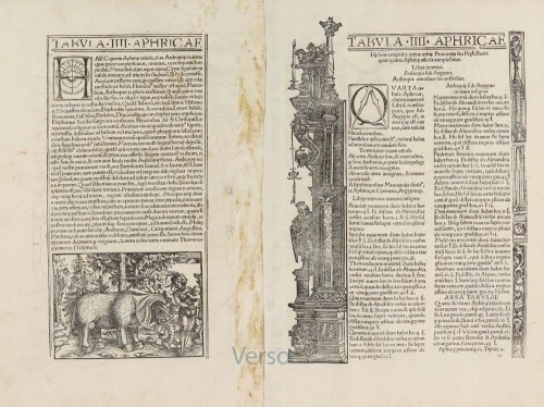 On the reverse, the text is contained within elaborate Renaissance woodcut panels, which may have been designed by Albrecht Dürer, the known contributor to diagrams elsewhere in the atlas.