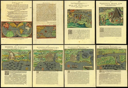 Set of antique maps of the World, the Atlantic Ocean, local American maps (4) and two historical scenes relating to Sir Francis Drake, by Theodor de Bry.