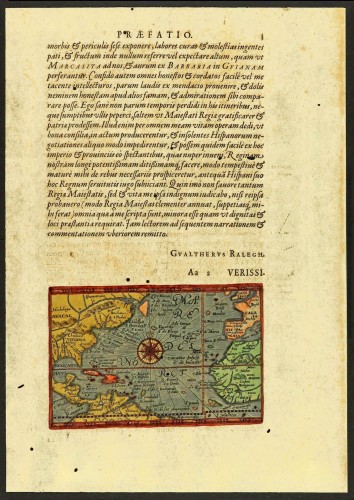 This map depicts the Atlantic Ocean in the Medina type and illustrates the coastline of parts of America, Africa and Europe. Virginia is recorded, showing the account of Drake's visit to Roanoke Island in 1586. It is directly drawn from that of Cornelis Claesz published in 1598.