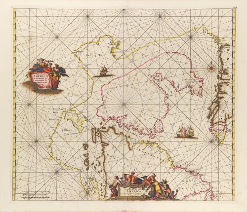 Septemtrionaliora Americae à Groenlandia, per Freta Davidis et Hudson, ad Terram Novam = De Noordelyckste Zee kusten van America van Goenland door de Straet Davis ende Straet Hudson tot Terra Neuf.
