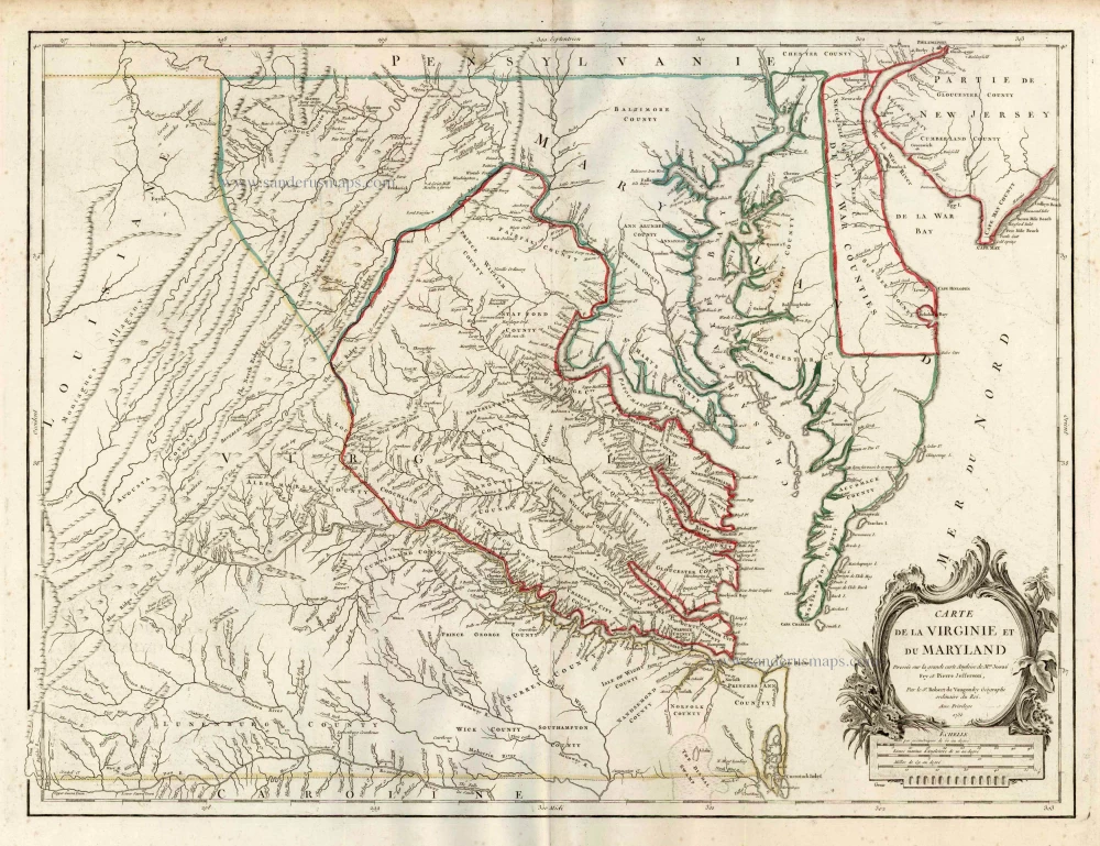 Old, antique map of Maryland & Virginia by Robert de Vaugondy.
