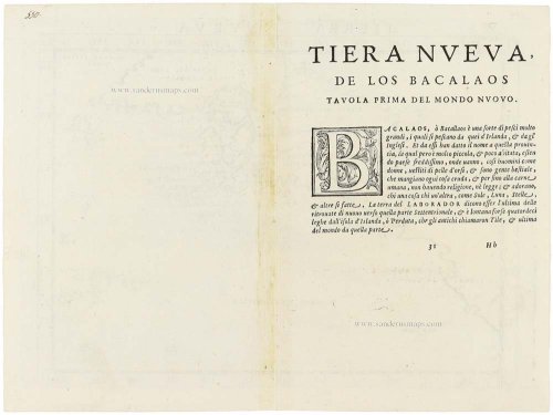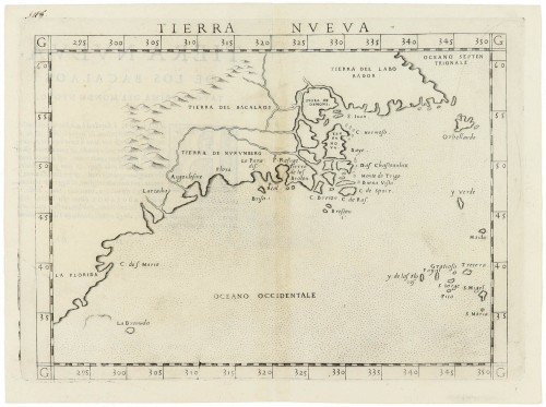 This map of the east coast is an enlarged version of Giacomo Gastaldi's published in 1548. The nomenclature and cartography are unchanged, with the exception of the depiction of the rivers. Here he borrowed the assumption of Ramusio that the Hudson and St. Lawrence Rivers, as we know them today, were connected upriver.