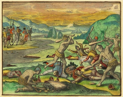 Concerning the 10 Spaniards who were attacked, beaten and robbed by the Indians. Great Voyages, De Bry, 1599.