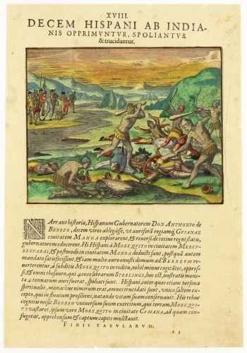 Title: Decem Hispani ab Indianis opprimuntur, spoliantur & trucidantur. (Concerning the 10 Spaniards who were attacked, beaten and robbed by the Indians.)