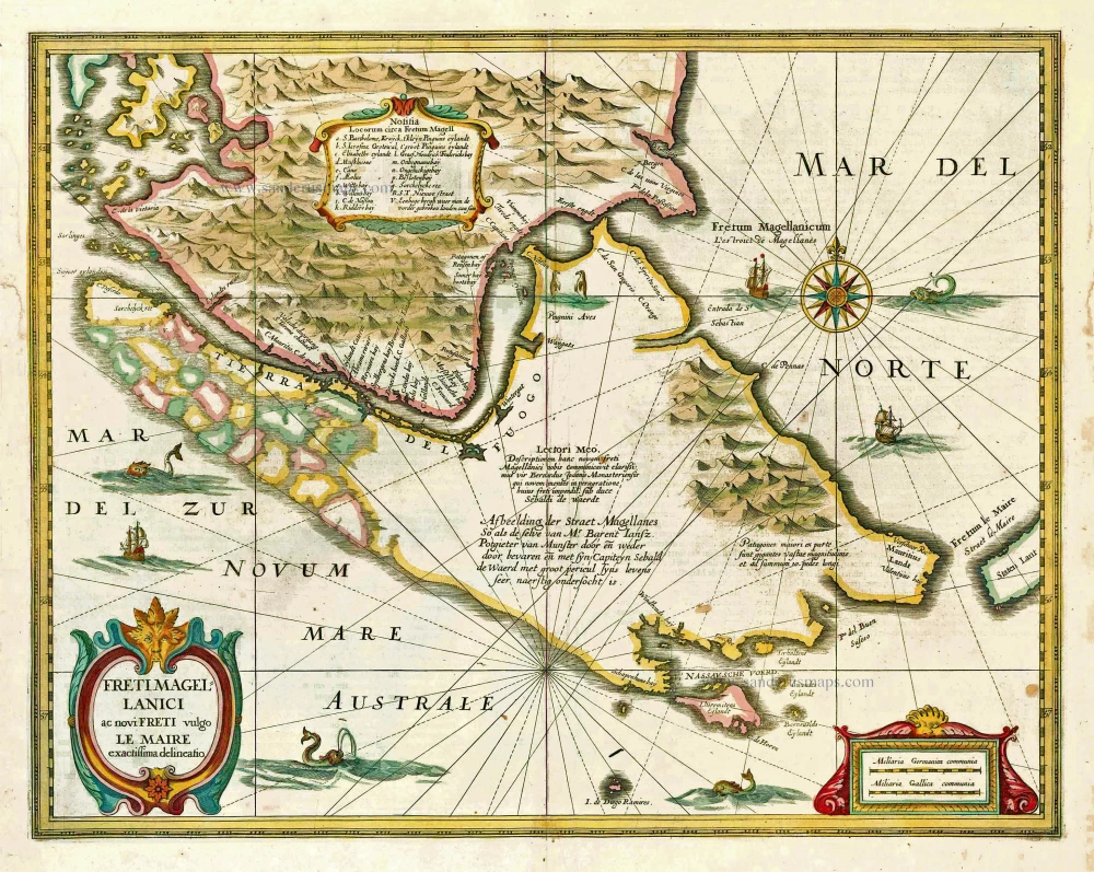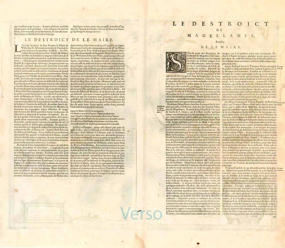 The map shows the results of the expeditions of Willem Cornelisz Schouten and Jacob Le Maire (1615-1617), who discovered Cape Horn, and those of the Nassau fleet under admiral Jacques l'Heremite and vice-admiral Gheen Huygen Schapenham (1623-1626).