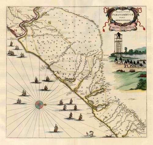 These maps are the first maps of Brazil based on Dutch rather than Portuguese interest. Between 1630 and 1654 a large part of Brazil was occupied by the Dutch. In this period the area was surveyed and mapped by the cartographers Cornelis Goliath and Georg Marcgraf. The results were compiled in a decorative wall map in 1643. Joan Blaeu used the wall map as his source for these maps.They appeared first in Caspar Barlaeus' "Rerum per octennium in Brasilia et alibi nuper gestarum ...", a book published by J. Blaeu in 1647, which remained for over a century the best guide to north-eastern Brazil.