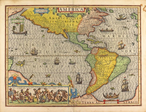 Until 1630, this attractive map was issued alongside the AMERICA sive INDIA NOVA by Michael Mercator 1595. Since the Mercator always used the text describing America, this one is always lacking. Produced on a stereographic projection like more and more maps of the time, it is an amalgam of various sources. It incorporates a correct west coast of South America. It narrows the longitudinal width of New Spain at the Tropic of Cancer, making it just 10°, much closer to reality. However, like all cartography, it retains an enlarged North American continent. A Plancius-type depiction of Newfoundland occurs alongside a typical period representation of the east coast, with a more protruding Virginia than usual. Various scenes from the earlier volumes of de Bry's Grand Voyages adorn the whole. Particularly notable is the native Brazilian scene illustrating the method of making a local beverage, derived from Hans Staden's voyage as recorded by de Bry. There are various ships, kayaks and Indian canoes, along with a pair of birds perched on the inset." (Burden)