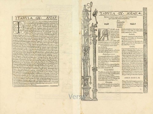 On the reverse, the text is contained within elaborate Renaissance woodcut panels, which may have been designed by Albrecht Dürer, the known contributor to diagrams elsewhere in the atlas.