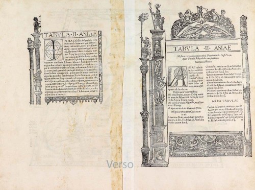 On the reverse, the text is contained within elaborate Renaissance woodcut panels, which may have been designed by Albrecht Dürer, the known contributor to diagrams elsewhere in the atlas.