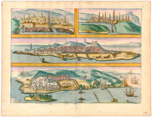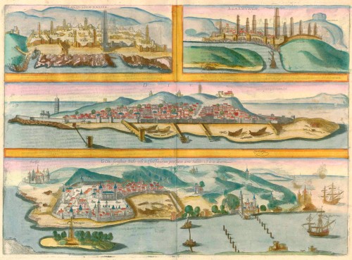 Casablanca (Anfa) - Azemmour (Azamor) - Diu - Old Goa (Velha Goa), by Georg Braun and Frans Hogenberg. 1599