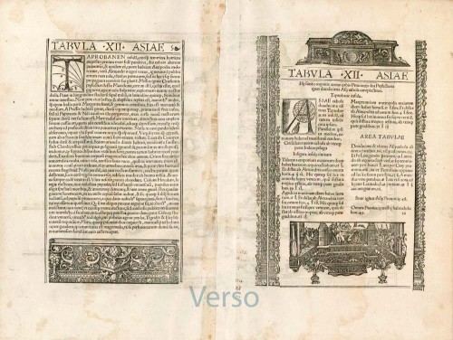 On the reverse, the text is contained within elaborate Renaissance woodcut panels, which may have been designed by Albrecht Dürer, the known contributor to diagrams elsewhere in the atlas.