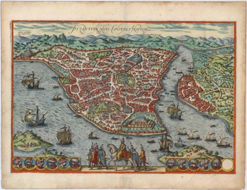 Antique map - bird's-eye view of Constantinople (Istanbul) by Braun and Hogenberg. The city view include monuments of Saint Sophia, Topkapi Palace. Twelve vignettes of Ottoman sultans line the bottom margin, including portraits of Soliman the Magnificent and Selim. Numerous ships in Bosphorus and Golden Horn. Mounted Sultan with entourage at bottom center.