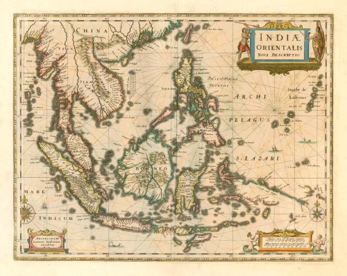 "The Hondius-Jansson publication included a completele new map of Southeast Asia and the East Indian archipelago by Jan Jansson entitled 'India Orientalis Nova Descriptio'. The map was the most accurate, as well as one of the most elegant, seventeenth-century maps of the East Indian Islands, and included one of the first inferences to the discoveries made on the northwestern coast of Australia in 1606 by William Jansz in the ship Duyfken. On the south coast of New Guinea the name 'Dufkens Eylant' appears, thereby immortalizing the name of the ship by which Australia had been discovered in 1606; however, the map only reaches ten degrees south latitude and does not show any part of the Australian mainland. The False Cape (Valschen Caep) and the Torres Strait or embayment, if they were mapped at all, would be hidden behind the decorative scale bar. Schilder believes that Jansson's map was of the greatest importance until the copy of the original 'Duyfken' map and the 1622 manuscript map of the Pacific by Hessel Gerritz, Blaeu's predecessor in the post of Official Hydrographer to the VOC, were found. William Blaeu must have been privy to these discoveries from his official position in the Dutch East India Company, but he did not publish his classic regional map, 'India Quae Orientalis Dicitur et Insulae Adiacentes' showing part of the Australian mainland, until 1635." (Parry, p.105)