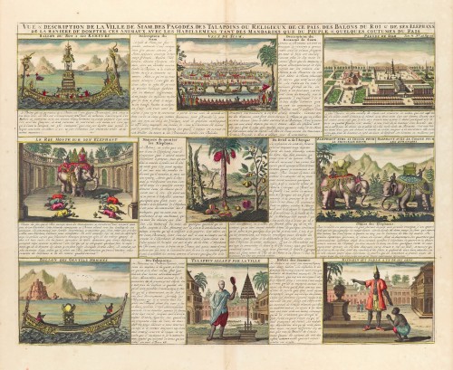 Vue & Description de la ville de Siam, des Pagodes, des Talapoins ou Religeux de ce Pais, des Balons du Roi & de ses Elephans, de la maniere de dompter ces animaux, avec les habillemens tant des Mandarins que du Peuple & quelques coutumes du Pais.