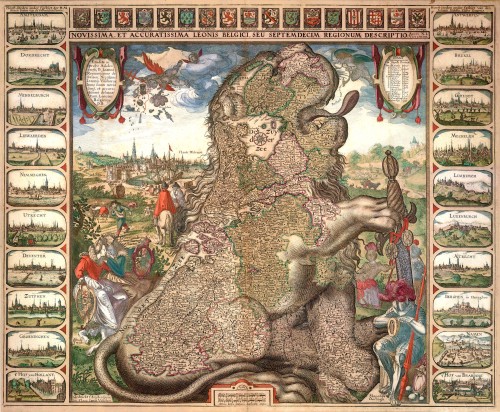 Exquisite map of the sitting lion, which van der Heijden calls "One of the peaks of 17th-century cartography". C.J. Visscher made this map on the occasion of the Twelve Years' Truce (1609-1621) between Spain and the United Netherlands, as appears from many a text on the map.
