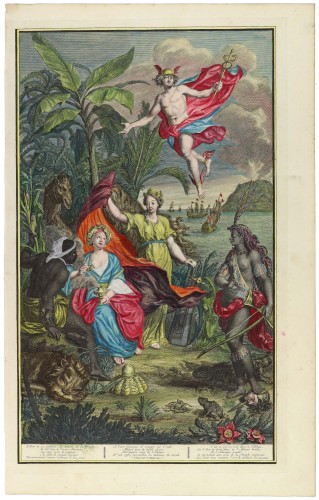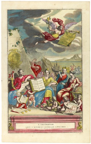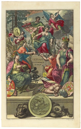 The Atlas Historique appeared in seven volumes, but not every volume had a frontispiece. Those for volumes III and VI were not present. The purpose of the many images and symbols in the frontispieces is to convey to the potential reader and purchaser of the work that the author has combined contemporary maps with historical learning and sound research based on the classical authors of the past.