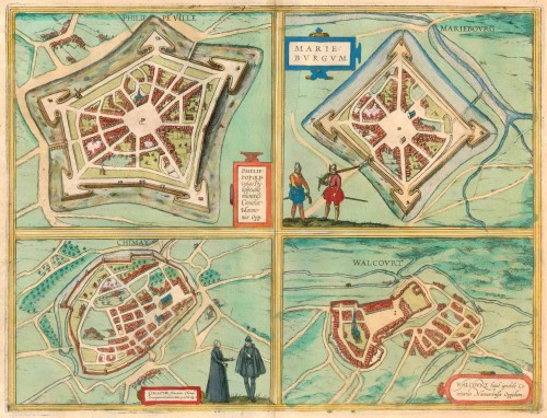 Four bird's-eye views on one sheet: Philippeville, Mariembourg, Chimay and Walcourt, by Georg Braun and Frans Hogenberg.