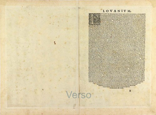 COMMENTARY BY BRAUN (on verso): "Louvain is the capital of Brabant and an important trade city, but also the seat of learned men and the Liberal Arts. It was established around 1422 by John, Duke of Brabant, and is a large and liberal city. Inside the city walls, it also has open meadows, vineyards, other large gardens, arable fields, orchards, fields, bushes, forest and pastures and very sizeable woods for walking in. There is nowhere better suited to accommodate the muses and scholarship than this city."
