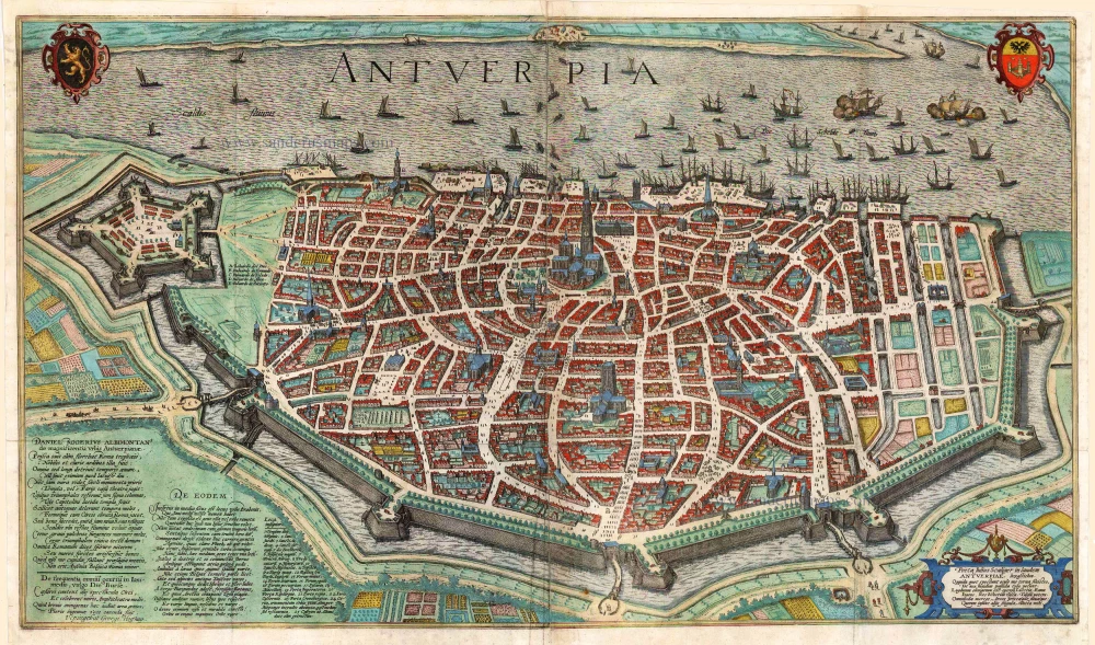 Spectacular bird's-eye view plan of Antwerp by Braun and Hogenberg after Georg Hoefnagel.