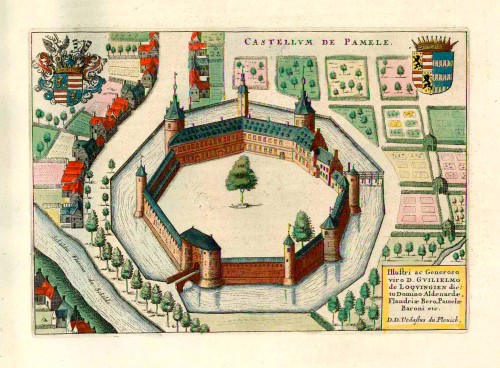 Old, antique bird's-eye view of Pamele Castle in Oudenaarde, by J. Blaeu.