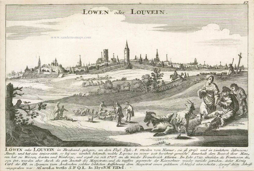Old antique view of Louvain (Leuven) by Bodenehr E. c. 1740
