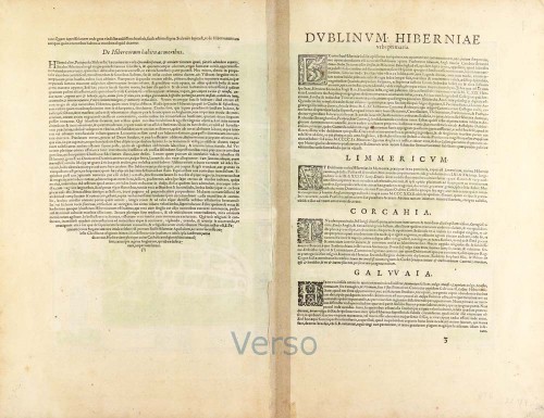 COMMENTARY BY BRAUN (on verso): "This is the most distinguished city in the countryside of Momonia and is called Luimneach by the Irish. The River Shannon divides into two arms here and flows around the city, making it well fortified and safe and suitable for goods traffic. There is an episcopal see here [...]; also a castle or a royal palace, which King John of England built.