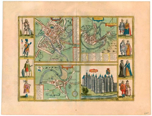 Old, antique bird’s-eye view plan of York, Shrewsbury, Lancashire, and Richmond, by Georg Braun & Frans Hogenberg.