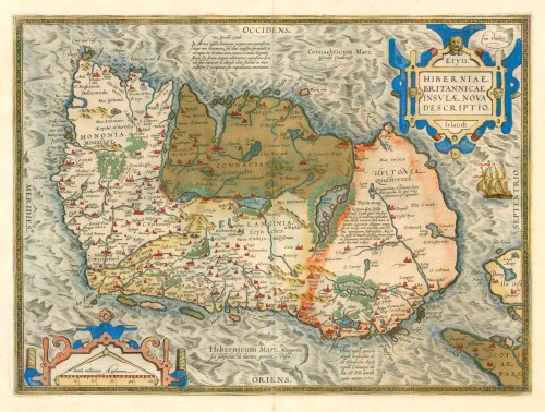 Antique map of Ireland by A. Ortelius, oriented to the West
