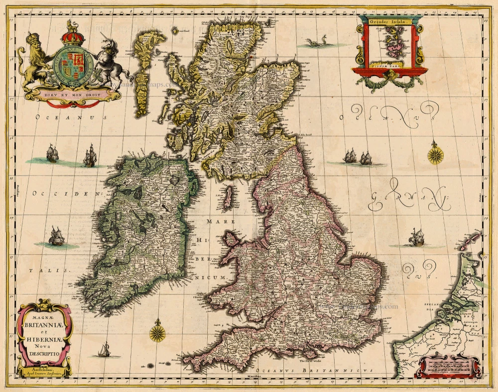Old, antique map of the British Isles by Janssonius 1638