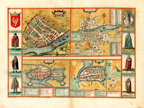 Left and right borders with costumed figures.Top right view of 'Enis Kelling Fort'. GALWAY COMMENTARY BY BRAUN (on verso): "The most distinguished city in Connacht is Galway [...]. It is surrounded by a wall and many towers, and spanning the river [...] is a stately bridge. Not far from the place where the river flows into the sea are many small islands [...], and the Irish say that no one can die there. [...] Now, you may believe that if you like. Such superstition comes from the vindictiveness to which this nation is prone, they care for nothing if only they can take their anger out on their enemies." This bird's-eye view from the west shows a well-fortified city. The great bridge with its high arches and the church of St Nicholas stand out clearly. The city's character as a port is underlined by the ocean-going ships. The city was founded in the 13th century as an Anglo-Norman outpost in the west of Ireland. In the 16th century there were several Irish revolts against English rule. Today Galway has a population of about 70,000. It is the cultural and economic centre of western Ireland and an important university town. The plate is framed by six figures: Irish noble / Irish burgher / Irish peasant; Irish noblewoman / Irish burgher woman / Irish peasant woman. DUBLIN COMMENTARY BY BRAUN (on verso): "This city is quite big and full of artisans and merchants. It has big and stately suburbs on both sides of the River Liffey, some of which are surrounded by walls. Here Henry II, the king of England, built a royal palace. Not far from it is a splendid college or school called Holy Trinity, which was granted the liberties of an academy or university by Queen Elizabeth." In this view from the south the city wall, on the right, Trinity College (12), founded by Elizabeth I in 1592, are readily discernible. The ships on the River Liffey make reference to the city's port. Founded as a fortified Viking settlement in the 9th century, the city was expanded and became a military base in the 12th century in the course of the Anglo-Norman colonization of Ireland. It was granted a municipal charter by Henry II in 1172. Members of the Irish population were not permitted to live in the city, and so they settled in the suburbs outside the city walls. LIMERICK COMMENTARY BY BRAUN (on verso): "This is the most distinguished city in the countryside of Momonia, and is called Luimneach by the Irish. The River Shannon divides into two arms here and flows around the city, making it not only well fortified and safe, but also suitable for goods traffic. There is an episcopal see here [...]; also a castle or a royal palace, which was built by King John of England. This bird's-eye view from the west portrays Limerick as a fortified town, with defences erected in the 12th-13th centuries during the Anglo-Norman conquest of Ireland. It shows the main city and the castle fortified with bastions (G), built by King John on an island in the River Shannon in the early 13th century, and a suburb on the mainland. The cathedral of St Mary's (E), which was begun in 1172 under the last Irish ruler of Munster, Donal Mor O'Brien, can be seen in the centre. CORCK COMMENTARY BY BRAUN (on verso): "Cork is nor very big and basically consists of only one long, broad street, but nevertheless it is densely populated and prosperous. Such rebellious people live in the surrounding areas that the citizens have no dealings with them and above all may not intermarry with them. This is why there is not one citizen who is not related to the others by blood or by marriage. This has such a good effect on diligence, peace and friendship that the whole city is like one big household." This is a view from the west of the fortified city on an island in the River Lee. The big Main Street is its dominant feature. Churches and monasteries are grouped around the city like outposts in enemy country; Cork was ruled by English merchant families. In the 13th century an Anglo-Norman trading base was set up on the site of an Irish settlement, which had grown up around a monastery founded by St Finbarr in the 6th century; in 1185 Cork was granted a municipal charter. The four views are made after maps by John Speed in The theatre of the empire of Great Britain, 1611.