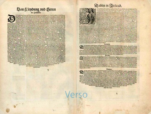 COMMENTARY BY BRAUN (on verso): "The most distinguished city in Connacht is Galway [...]. It is surrounded by a wall and many towers, and spanning the river [...] is a stately bridge. Not far from the place where the river flows into the sea are many small islands [...], and the Irish say that no one can die there. [...] Now, you may believe that if you like. Such superstition comes from the vindictiveness to which this nation is prone, they care for nothing if only they can take their anger out on their enemies."