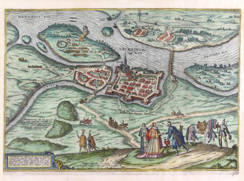 SIGNED AND DATED BOTTOM LEFT: Iaverium, once drawn most accurately by the Italian Nicolas Aginelli in the year 1566, transferred from a somewhat larger to a smaller format, kindly provided by Georg Hoefnagel at the request of his friends in Cologne in the year 1597.