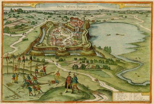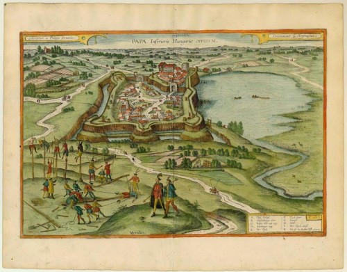 Bird's-eye view of Papa in Hungary by G. Hoefnagel, 1617. Key to 10 locations.