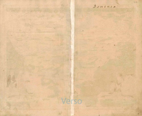 The title runs across the top of the map. In the lower left corner a view of Prague (Praga) is placed, combined with a Latin dedication to Eilhard Lubinus, professor of mathematics at Rostoch University, signed by Van der Keere (Petrus Kaerius Flan.). In the lower right corner - as pendant to the Prague-view - the Imperator's residence (Kaisers Hof) is shown. A costumed couple and a shield with the Imperial coat of arms complete the decoration. Between the cartouche with the scale bar and the view of the Kaisers Hof Van der Keere's 1618 dated imprint is placed. The geographical content is based on the map of Bohemia in Ortelius's Theatrum orbis terrarum of 1570 on, which goes back to the map of Johann Criginer (1521-1571). A later edition was published by Everard Cloppenburgh, who was active in Amsterdam as a publisher in the period 1631-41. The imprint on Van den Keere's plate at the bottom is in this edition changed to: Amstelodami Everardus Cloppenburghius excudit. (Schilder)