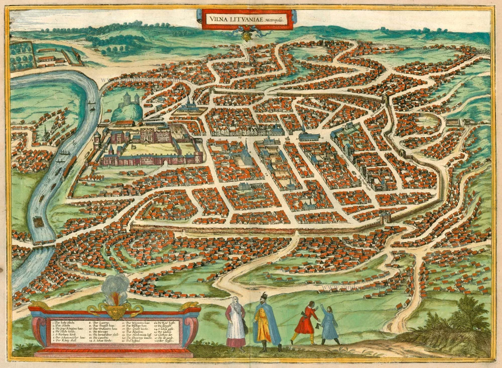 COMMENTARY BY BRAUN: "Vilnius is a large, densely populated episcopal city in the Duchy of Lithuania. The city is enclosed within a wall and gates, which, however, are no longer sufficient; all the houses in it are made of wood and very low and plain, except for certain streets in which foreign merchants have erected handsome houses made of stone. There are two royal palaces, one very spacious and famous for its halls. The other palace is on a hill, and one can see very far from its towers. There is also a magnificent monastery dedicated to St Bernard here."