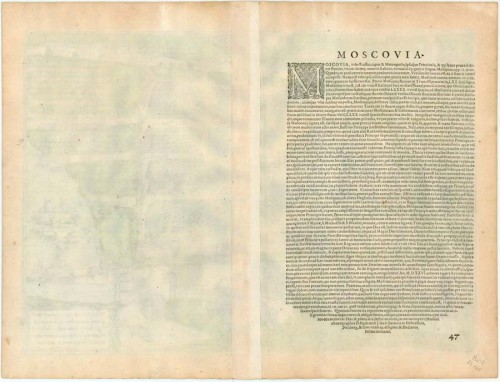 TRANSLATION OF CARTOUCHE TEXT: Moscow, the capital of the eponymous region, twice as large as Prague in Bohemia, has wooden buildings, and many streets, but scattered, with wide spaces in between them. The Moskva irrigates the city.