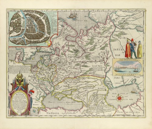 In 1612-13, Hessel Gerritsz. was intensively busy with publications about Russia. In 1612, he published the influential booklet Beschryvinghe vander Samoyeden Landt. The two chapters about Siberia were provided by Isaac Massa, who had lived in Moscow for nine years. With the aid of original Russian material, Gerrritsz. produced a series of three maps in folio format: a map of Russia and Moscow and the Kremlin town plans. He also made an essential new wall map of Lithuania and engraved it on four plates for Willem Blaeu. In the meantime, he also made a wall map and a folio map of Spain.