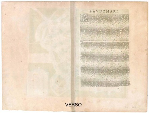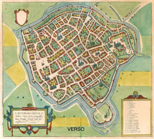 COMMENTARY BY BRAUN (on verso): "Saint-Audomar, commonly known as Saint-Audmar, and, in the mutilated form read by some, Saint-Omer, a small town in Artois, gets its name from St Audomar, a German, a priest born not far from Constance [...]. Through the recommendation of King Pippin and the bishop of Noyon, he was appointed bishop to the Morini or Flemings. Because he was a man of pious conduct, Adroaldus, a rich and noble man, was later persuaded to present him with the hamlet of Sithieu and the surrounding area to build a monastery there. [...] Through the teachings of these men a large number of people came to the little village of Sithieu and began to build a town, which was later named St Audomar or St Omer in honour of this excellent bishop."