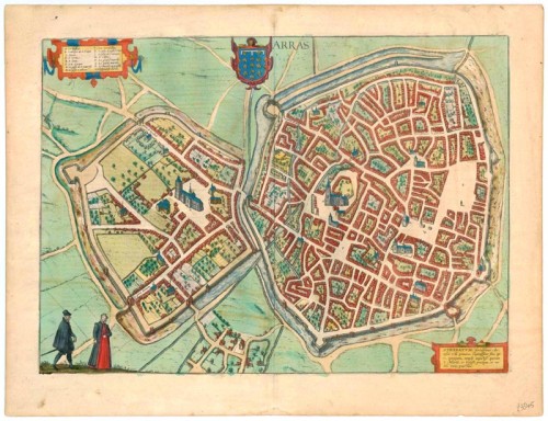TRANSLATION OF CARTOUCHE TEXT: Arras, capital of the very fertile Artois, is distinguished by its beautiful location, the industry of its inhabitants, as a diocese, by its magnificent churches, in particular St Maria and St Vaast, and by its famous citizens.