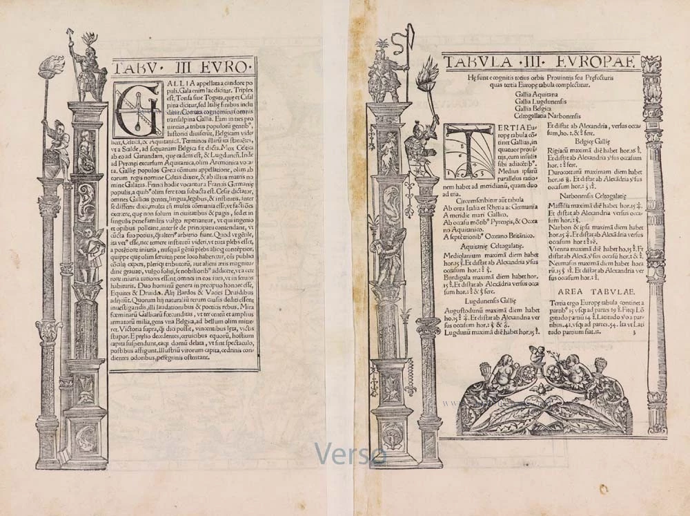 On the reverse, the text is contained within elaborate Renaissance woodcut panels, which may have been designed by Albrecht Dürer, the known contributor to diagrams elsewhere in the atlas.
