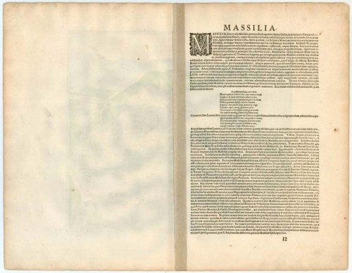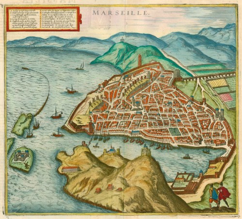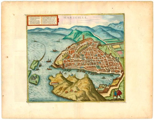 COMMENTARY BY BRAUN (on verso): "Marseilles, called Massalia in Greek, Massilia in Latin, is a rich city in Provence in France. It was built by the Greeks, which is why the inhabitants are endowed with good manners and admire and practise the liberal arts. The city allied itself with the Romans, who, however, corrupted and plundered it as a result of their pride and insatiable greed. [...] Although Marseilles can be highly praised for a variety of reasons, [...] Marseilles deserves eternal praise because it was one of the first cities to accept the redeeming faith directly after the birth of Christ."
