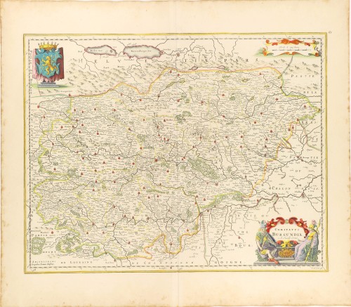 Joannes Janssonius (Arnhem, 1588-1664), son of the Arnhem publisher Jan Janssen, married Elisabeth Hondius, daughter of Jodocus Hondius, in Amsterdam in 1612. After his marriage, he settled down in this town as a bookseller and publisher of cartographic material. In 1618, he established himself in Amsterdam next door to Blaeu’s bookshop. He entered into serious competition with Willem Jansz. Blaeu when copying Blaeu’s Licht der Zeevaert after the expiration of the privilege in 1620. His activities concerned the publication of atlases, books, single maps, and an extensive book trade with branches in Frankfurt, Danzig, Stockholm, Copenhagen, Berlin, Koningsbergen, Geneva, and Lyon. In 1631, he began publishing atlases together with Henricus Hondius.
