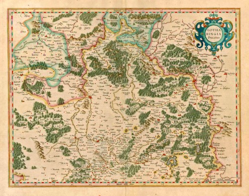 In 1544, Mercator came into great danger: he was arrested on the accusation of heresy and put into jail. Thanks to the intervention of the University of Louvain, he was released after four months. In 1552, he moved with his family to Duisburg (Germany). In 1560, Mercator became a cosmographer in service of the Duke of Jülich-Cleve-Berge, and in 1563, he became a lecturer at the Grammar School of the new University in Duisburg. During this period, he made wall maps of Europe, 1554; of Loraine, 1564; the British Isles, 1564; and the famous world map with increasing latitudes, 1569. About this time, Mercator was also working on the project for a complete description of the creation, the Heavens, Earth, Sea and world history. This resulted in his Atlas, sive cosmographicae meditationes de fabrica mundi et fabricati figura. He also worked on an edition of Ptolemy’s Geographia in 1578. The first part of his book, which contains modern maps (France, Germany, and the Netherlands), appeared in 1585.